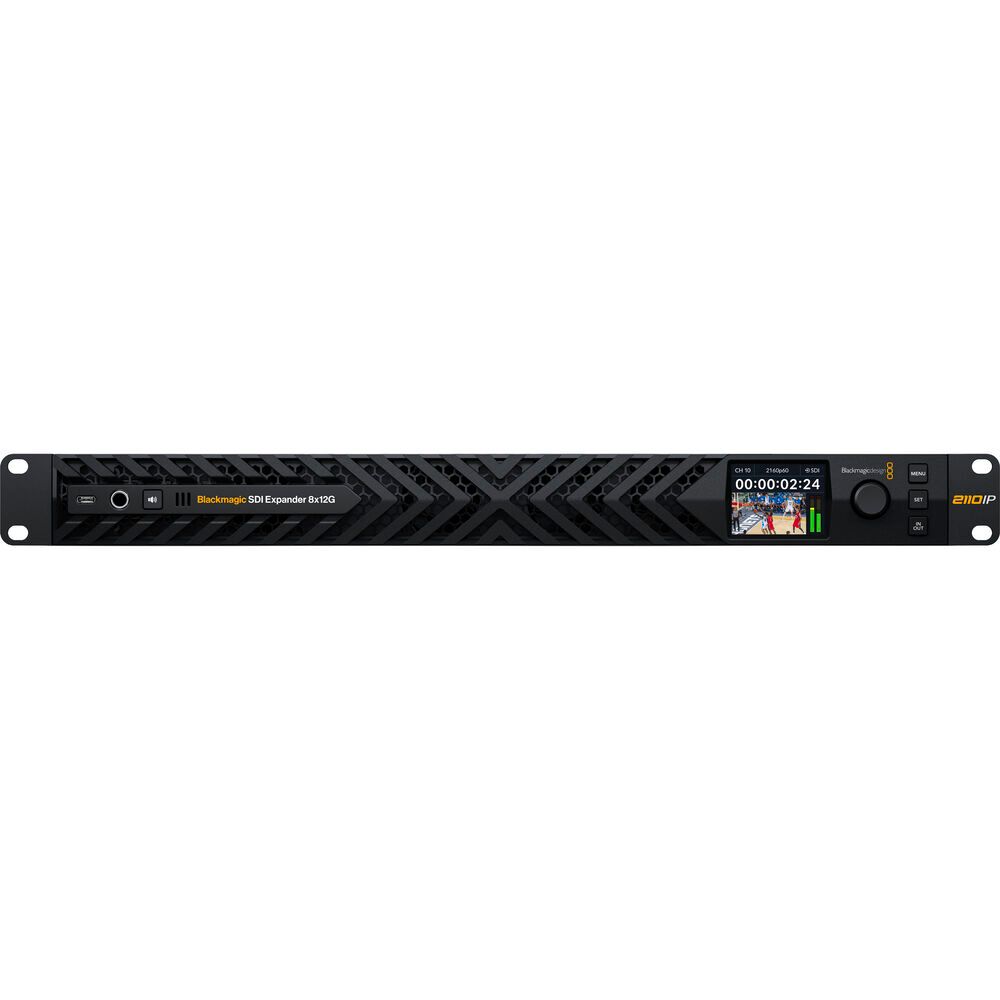 The Blackmagic Design SDI Expander 8x12G is a 1 RU bidirectional SMPTE 2110 IP converter designed to integrate 12G-SDI infrastructure into high-bandwidth 100GbE broadcast systems. Supporting up to 16 channels of simultaneous 10-bit 4:2:2 video conversion, the unit converts eight independent 12G-SDI inputs to SMPTE 2110 IP while concurrently converting eight SMPTE 2110 IP streams back to 12G-SDI outputs. Dual 100GbE QSFP28 connections provide SMPTE ST 2022-7 redundancy, ensuring uninterrupted signal delivery across IP-based production workflows.