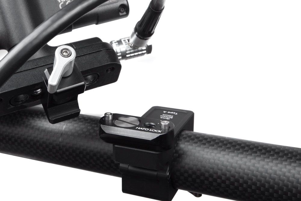 NATO Lock Kit is a quick release set based on a NATO standard rail. The rail portion can bolt into a 1/4-20 or 3/8-16 hole using the included screws. Set screw can also be installed to prevent twisting. The rail is also threaded for 1/4-20 and 3/8-16 so accessories can screw into it.