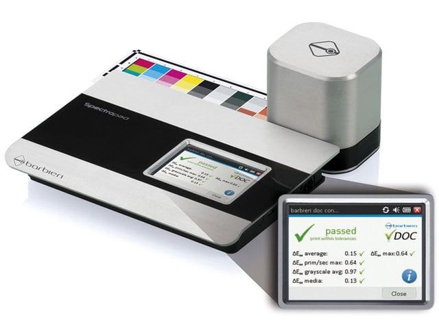The Barbieri Spectropad is the new portable measurement device for all professionals within digital printing including large and wide format printing. Thanks to its large measurement aperture it is able to accurately measure a wide range of different, reflective media. Banner, cardboard, textiles, canvas, PVC, Fine Art Paper, vinyl and Paper are just a few of them. This new wireless, battery poweredspectrophotometer can be operated without a computer and therefore directly at the printer, even without cutting the media. Jobs can be stored in the device and measurement results (if requested) sent through WiFi to the computer.