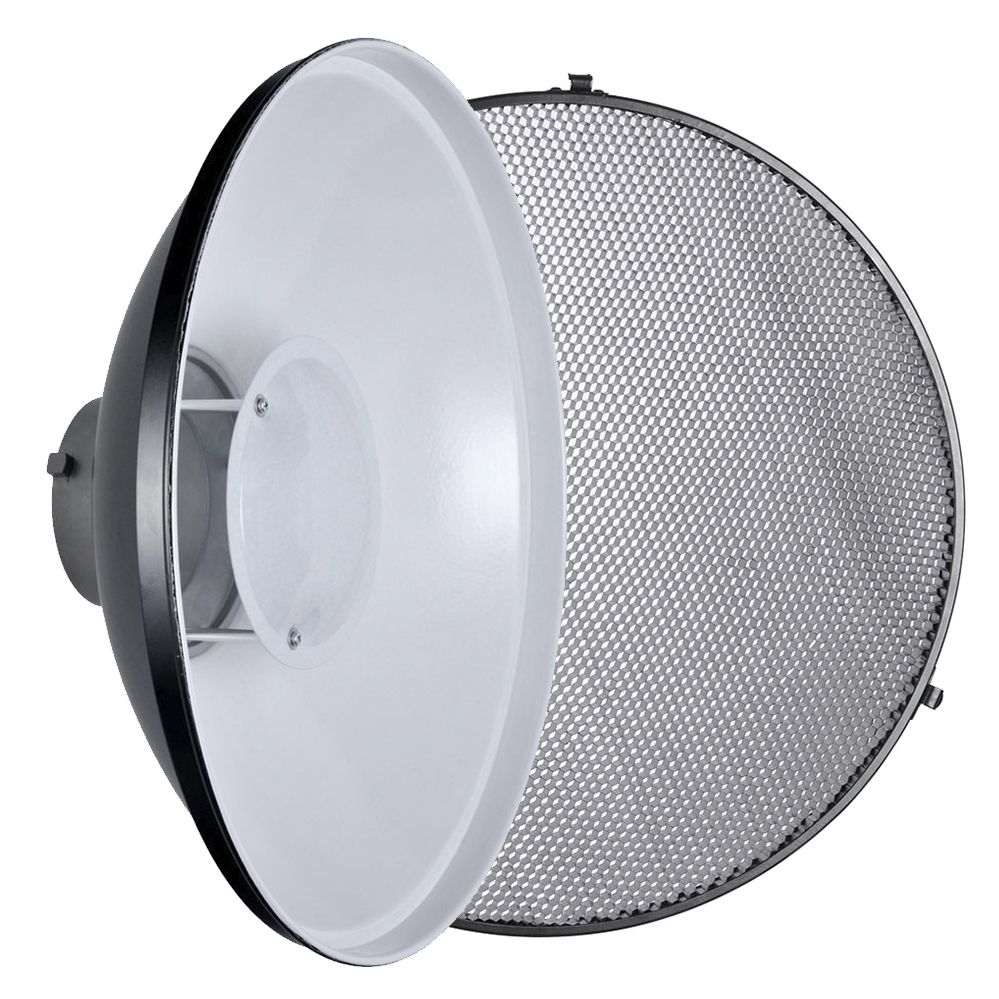This 42cm beauty dish comes with a soft white inner and a silver deflector. The deflector dome reflects light into the main dish producing soft diffused light. It's a great alternative to a softbox and as an option you can purchase a removable honeycomb grid to create a directional light and elliminate harsh shadows. It's easily removed, attached by 3 metal clips. The grid helps to reduce the scattering of light and obtains a soft diffusion. Both can be used in combination in producing a soft transitional edge, good stereoscopic effects.