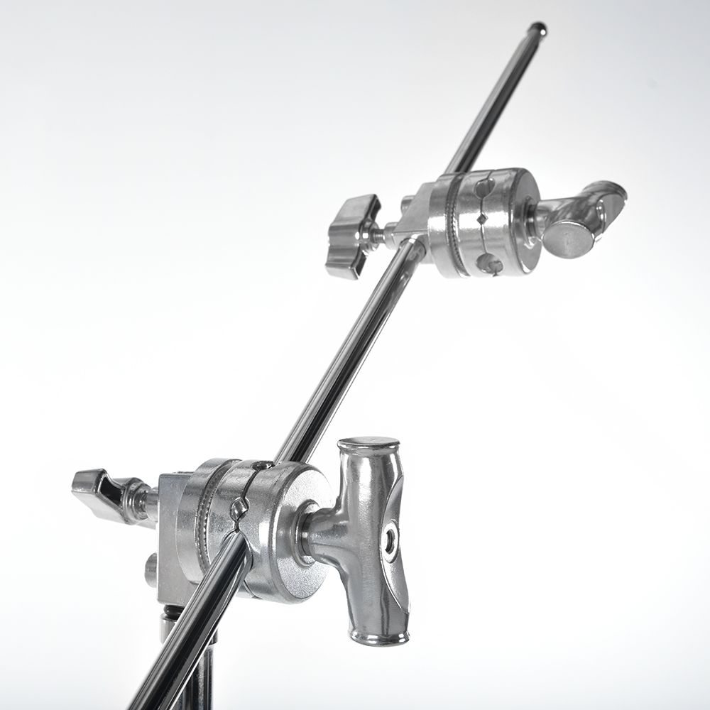 The Xlite Silver C-Stand Kit with Arm, Grip Head & Sliding Leg features chrome plated steel construction and a 3 section column with 2 risers. The innovative design of the base allows the individual legs to be set at any angle allowing positioning in locations not possible with classic stands. One of the legs slides along the center column to accommodate uneven terrain. The legs fold flat for easy storage.