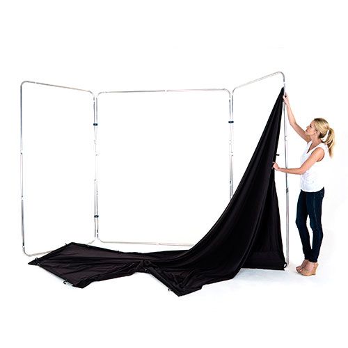 The Panoramic Background is one of our widest, crease free textile surfaces. It features a collapsible three panel aluminium framework, which creates a useful self-supporting wraparound structure. The fabric cover simply clips to the aluminium frame and is available in three colours - White, Black and Chromakey Green. The Panoramic Background stands 2.35m in height is ideal for shooting larger groups on location, perfect for weddings, prom nights and event photography. The background folds down neatly into it's own case and fits easily into a car.