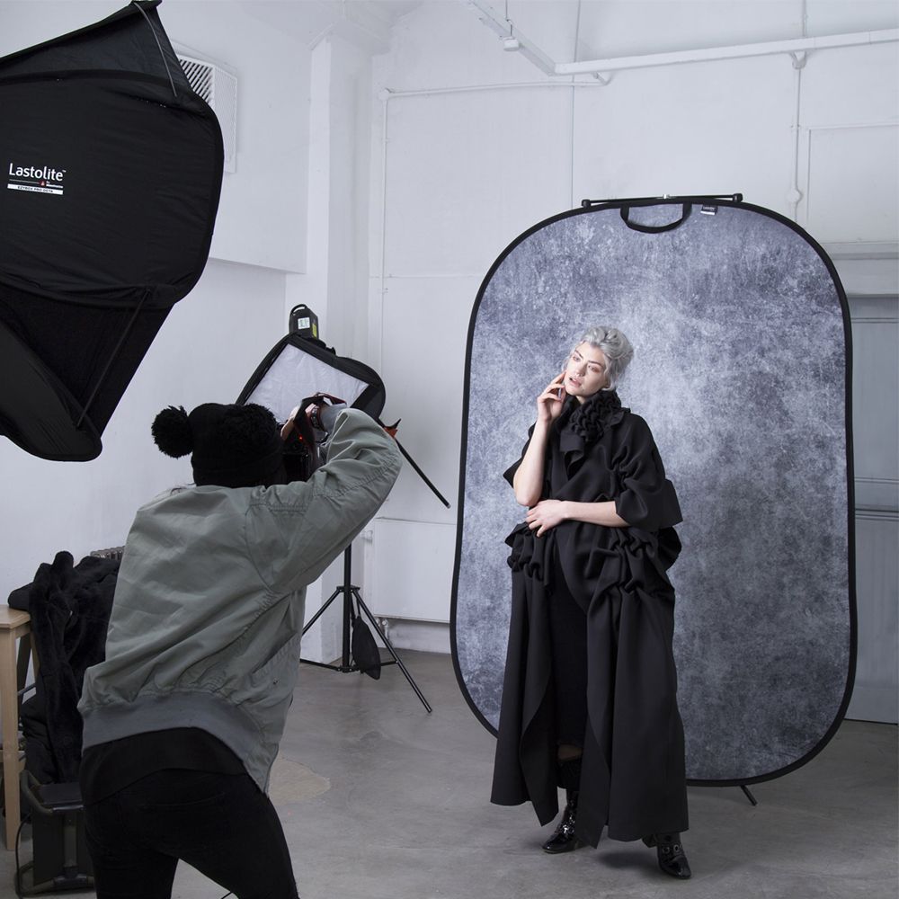 The Smoke / Concrete Urban Background offers a distinctive vintage style look, great for portraits, fashion and product photography. This versatile reversible background provides a timeless hand painted backdrop look that subtly complements the chosen subject. The darker of the two surfaces ‘Smoke’ offers a combination of grey tones with a subtle hint of green and also features a dark vignette effect. Whilst the reverse surface ‘Concrete’ offers a more evenly distributed grey tonal texture.