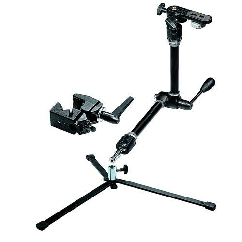 The Manfrotto 143 Magic Arm Kit is designed to hold a light fixture or camera in place, in a variety of situations. The heart of the kit is the Magic Arm an elbow arm, with sure locking lever control at the pivot. The removable camera mount pans and locks, and has a standard 1/4-20" thread mount. With the camera mount removed, it will accept any light fixture up to 3Kg that has a baby (5/8") receptor.