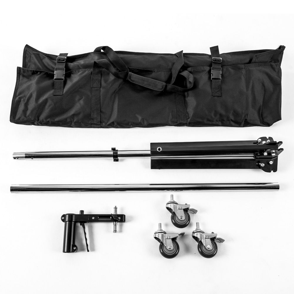 The Xlite Steel Studio Column Stand features an aluminium post, height adjustable from ground level to 220cm. Complete with positive braked wheels and a Sliding arm with a spigot attached for mounting lights or other items.