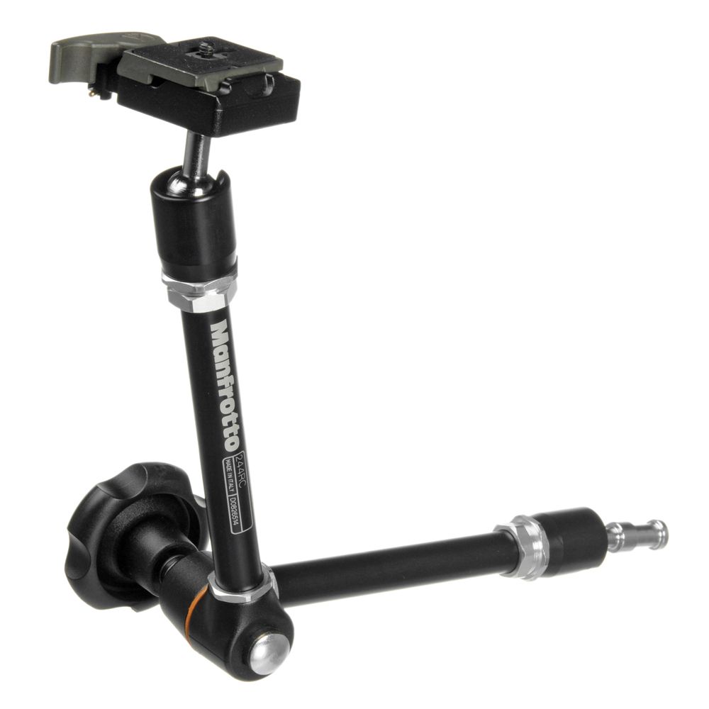 The Manfrotto Variable Friction Magic Arm with Quick Release is a fully articulated arm with 90° pivotable and 360° rotatable ends, and an elbow that rotates 360°. Its camera platform has a quick release mechanism and removable camera plate. The camera plate has a 1/4"-20 thread.
