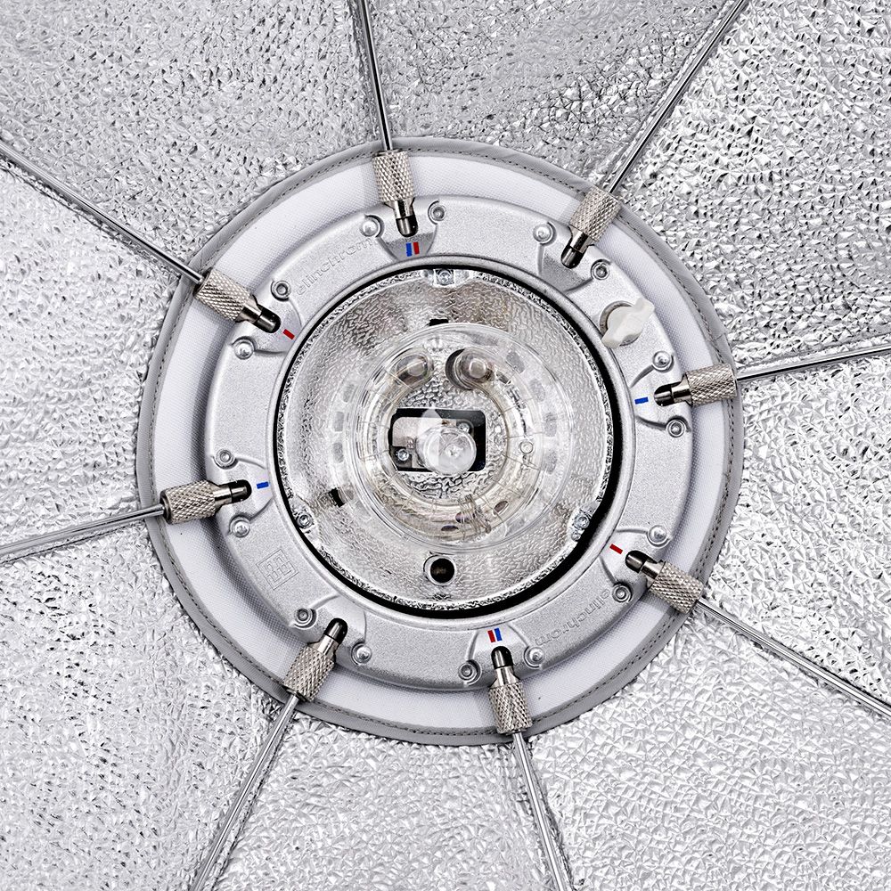 The Elinchrom Rotalux Deep Octabox has become the most popular shape among Rotalux users. The narrow shaped Deep Octa reduces the spread of light and offers sharper shadows compared to standard sized octagonal softboxes. They provide a very even diffuse light over the front screen and are an excellent crispy and direct light when used without diffusers to give a beauty dish look. The quality of light is outstanding because of it's construction and the internal diffuser provides the softest and most even light possible.