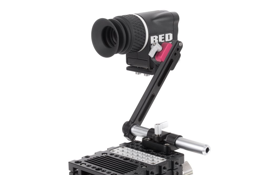 UVF Mount v2 accepts most EVFs and LCDs. Three points of adjustment: 15mm tube clamp for tilt and distance to the camera, NATO thumbscrew (identified by red component) for positioning on NATO rail, and tension thumbscrew to adjust tilt of EVF. Tool-less design allows quick installation and removal of UVF v2 Sled. Safety pin prevents accidental removal. UVF v2 Sled can attach directly to any NATO-style rail and includes adapter for using SmallHD and Alphatron viewfinders.