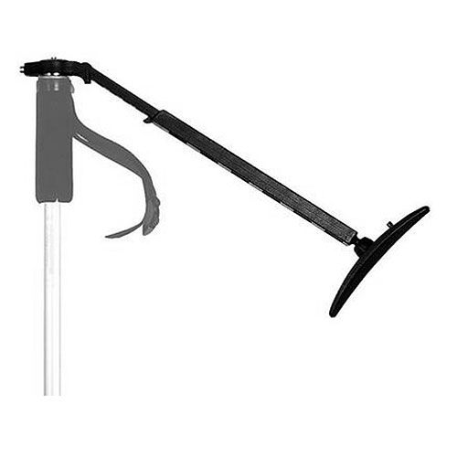 The Manfrotto 361 Shoulder Brace for Monopods is a bracket that fits against the shoulder to provide extra support and greater stability to a monopod. One end connects to the top of the monopod via the monopod's 3/8" screw, and the other end features a curved shoulder support, with an adjustable pivoting arm in between.