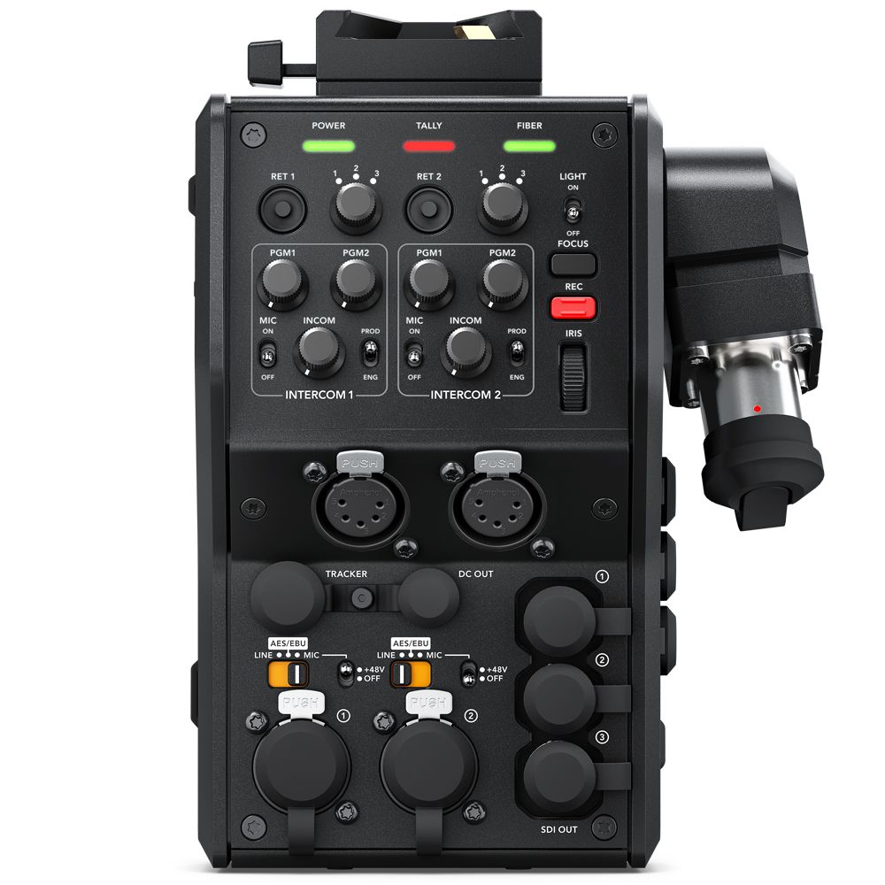 The Blackmagic Camera Fibre Converter attaches to the back of your URSA Mini or URSA Broadcast camera. In addition to converting all of the audio, video, camera control and talkback into fibre, it also adds professional studio camera controls to the back of your camera.