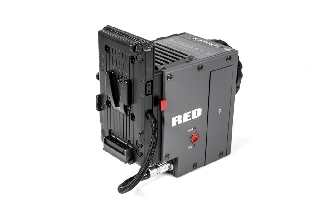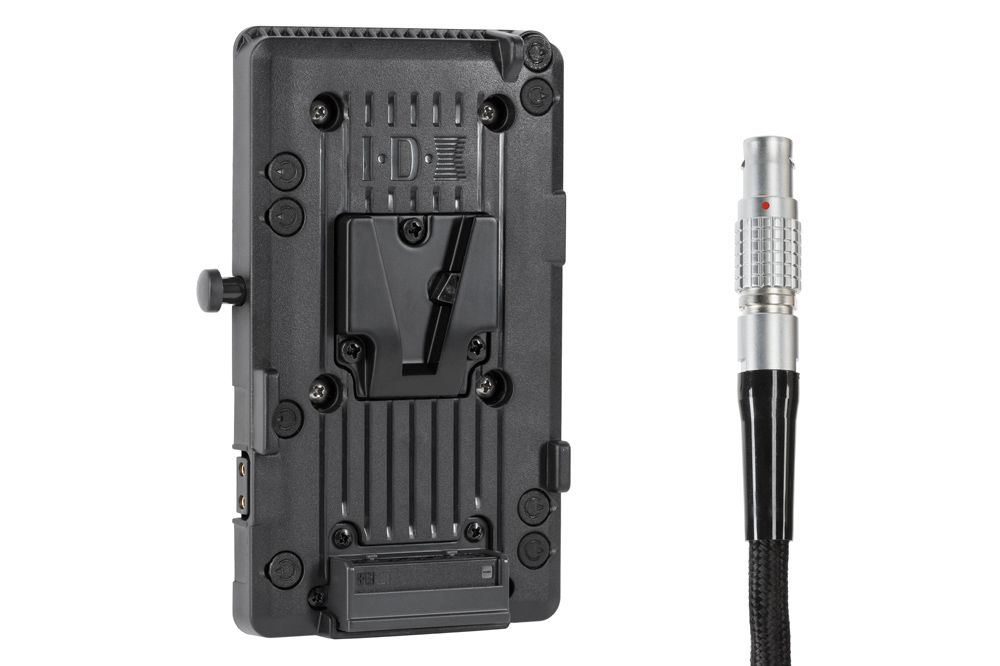 Wooden Camera brand V-Mount plate utilising an IDX V-Mount and RED Epic/Scarlet LEMO compatible connector. This plate is wired correctly to display RED Brick and smart V-mount battery percentage on displays.
