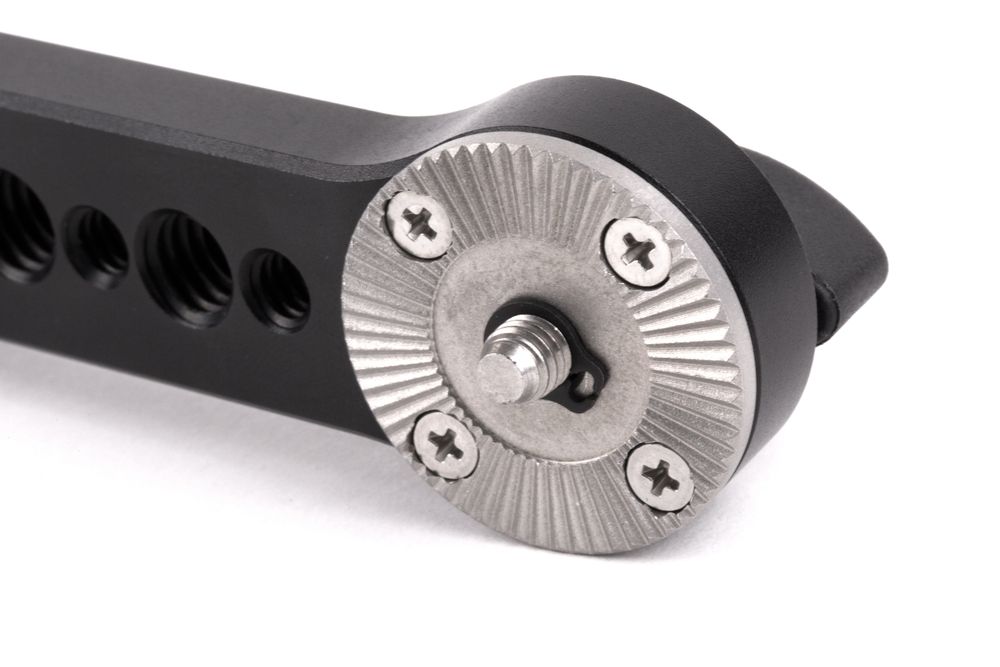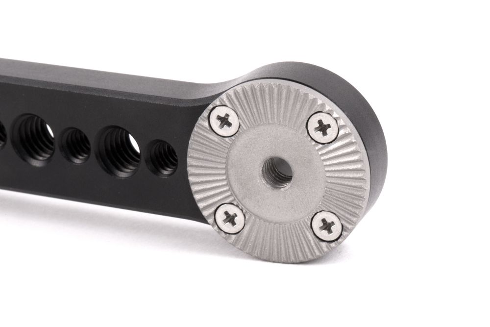 Rosette Arm (Short) is a short extension for ARRI standard rosette gear. M6 thumbscrew on one end and M6 threaded hole on the other. 1/4-20 and 3/8-16 holes for attaching accessories. Extension length is approximately 100mm or 3.93 inches.