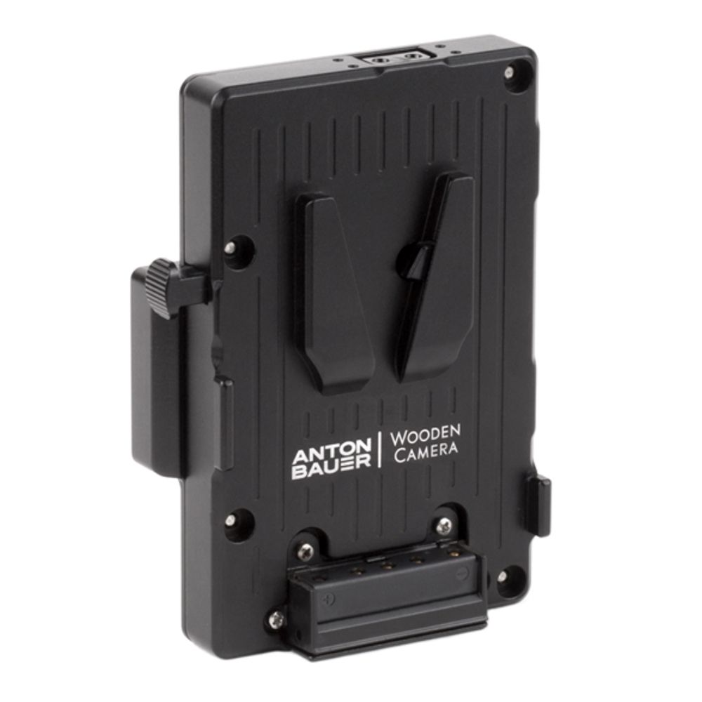 Wooden Camera brand Pro Battery Adapter converts a camera side Gold Mount plate to a battery side V-Mount plate. The metal power plate was created in partnership with Anton Bauer, and features a rugged aluminium body for durability and secure battery mounting, with 3x D-taps for accessory power.