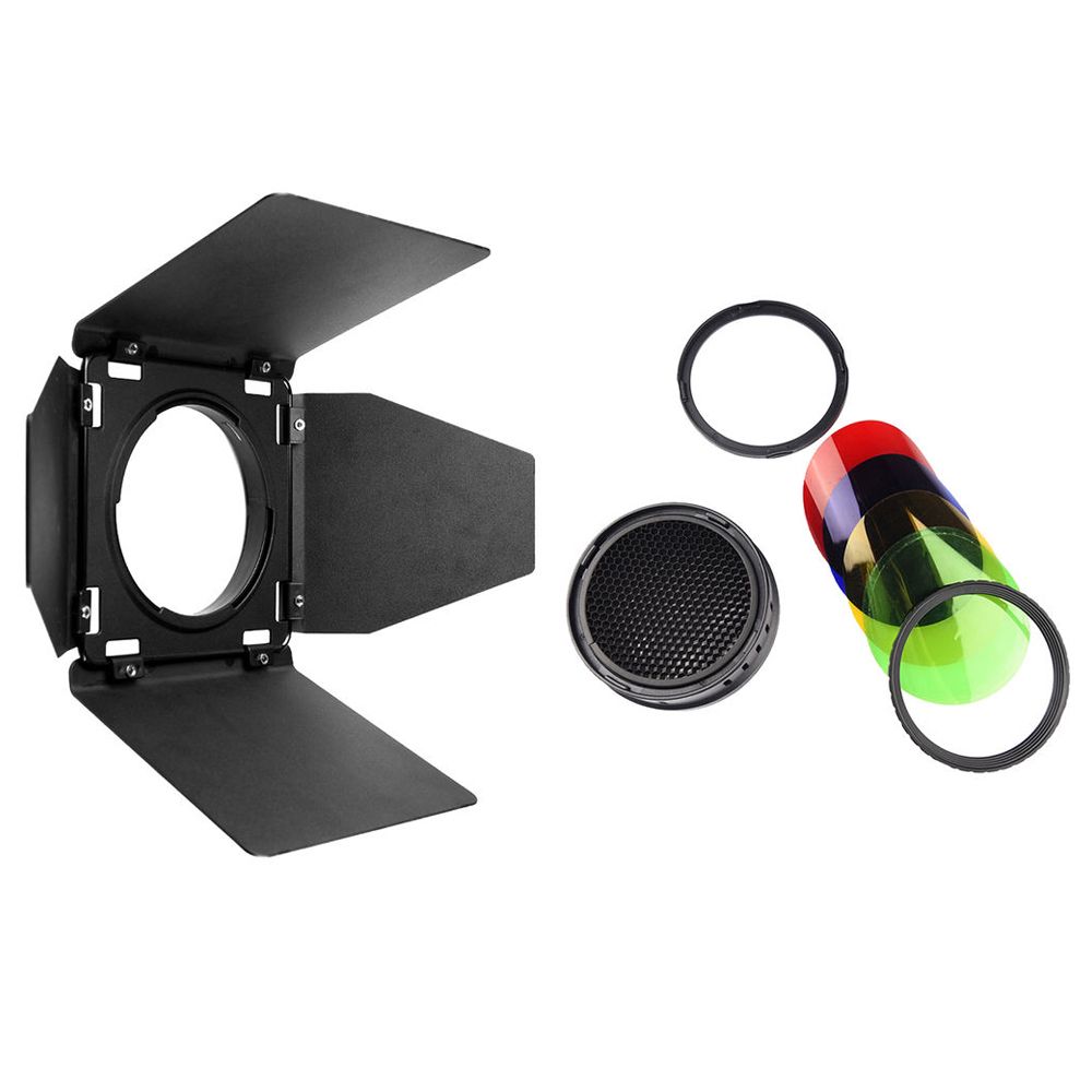 The Godox Barndoor Kit for AD400Pro Outdoor Flash contains a 4-way barndoor set, honeycomb grid, and one each, green, blue, red, and yellow filter. The barndoors allow you to light areas of the subject you want to and keep light from areas that you don't want illuminated. The grid narrows the beam spread into a soft edged circle which is ideal for uses like hair lighting. The color filters are provided for creative expression.