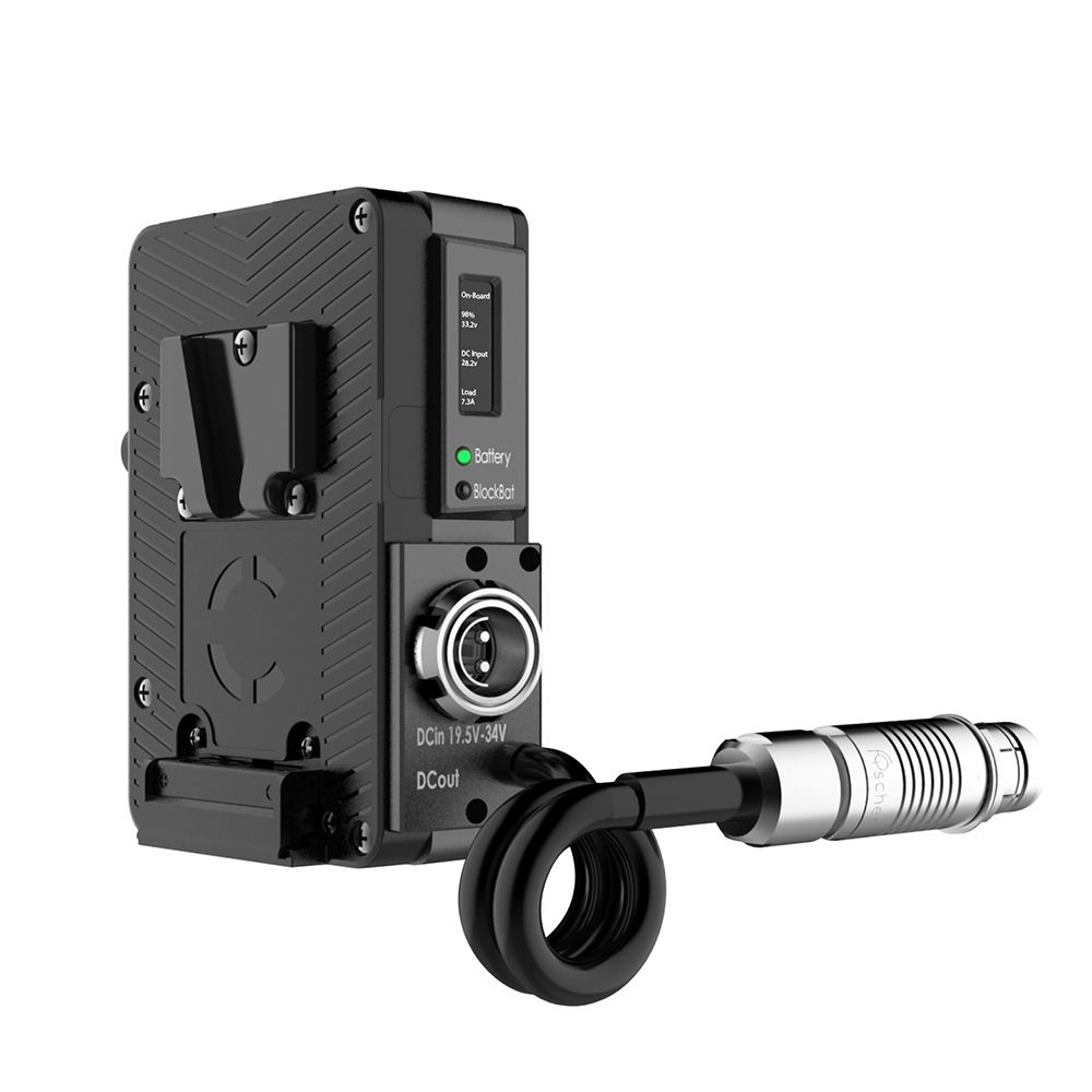 It provides 11 to 34 VDC battery input and output and inputs 19.5 to 34 VDC via its 2-pin Fischer connector to provide power failover. There are also two D-Tap outputs that provide 11 to 17V to power your camera or accessories as well as a 2-pin Fischer output connector for failover and to power additional equipment. The mount features an LCD screen that shows power voltage and percentage information as well as total power draw.