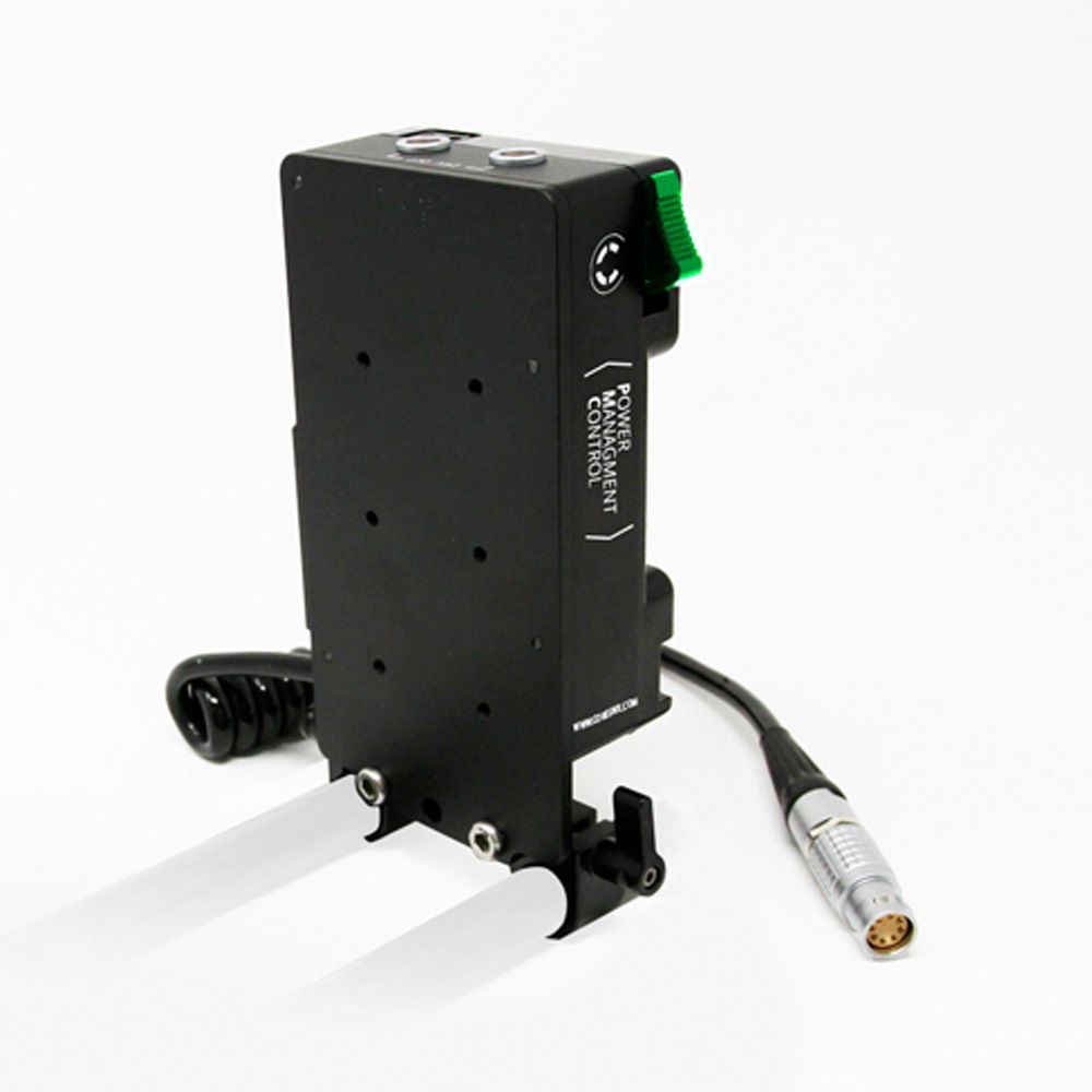 The HLX Power Management Control mount plates take power management concerns away from the camera, and provide a “hot swappable” platform between on-board and block battery/AC mains, while providing transparency to the AC on set. The mount plate system uses an 8-pin Lemo connector for the power input on the plates.