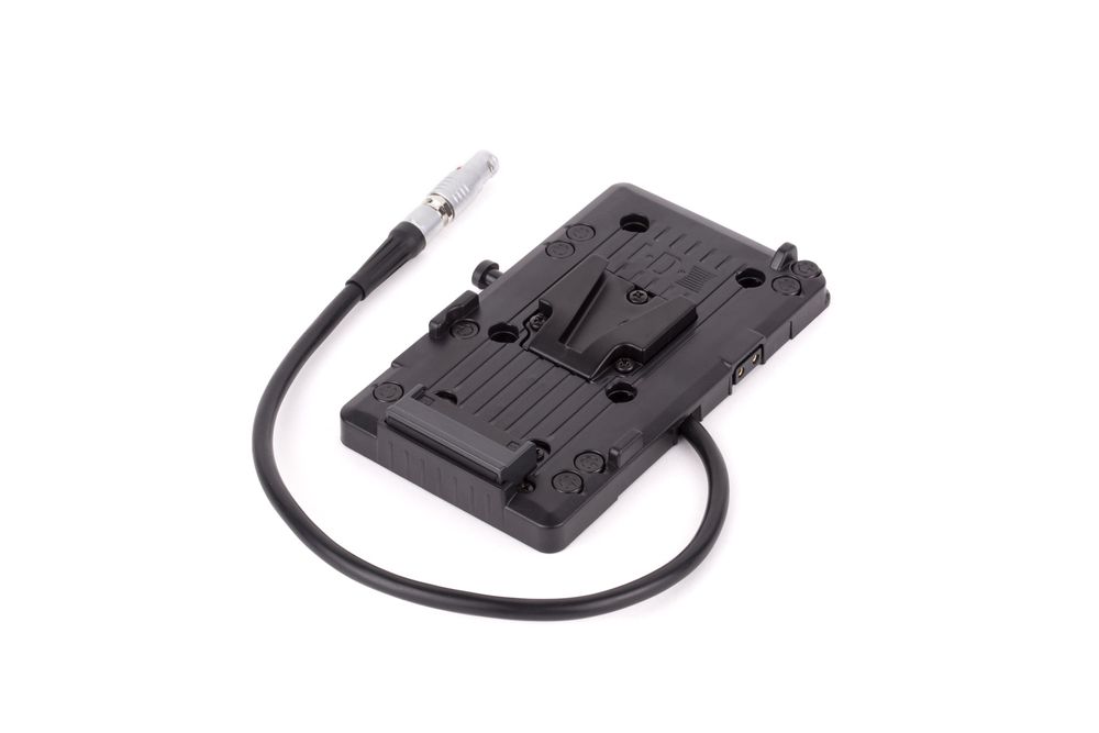 Wooden Camera brand V-Mount plate utilising an IDX V-Mount and Canon C300mkII, C200, C200B LEMO compatible connector. The 12" cable exits the right side of the plate allowing easy insertion into the camera.