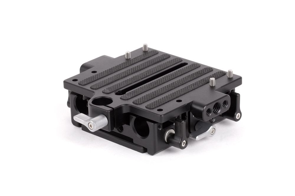 Unified Baseplate (Alexa Mini) is a quick release baseplate that provides lightweight 15mm rod support at the correct lens height. 15mm rods pass through front to back and have two locking thumbscrews per side. This baseplate can also be purchased as a set with the cage components here: Unified Cage (Alexa Mini). The baseplate quick releases in two ways, giving the user the option to take the 15mm lightweight rods or to leave them behind.