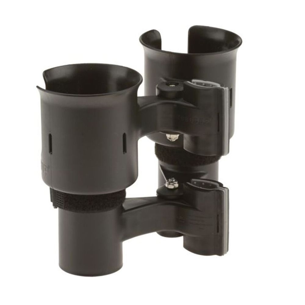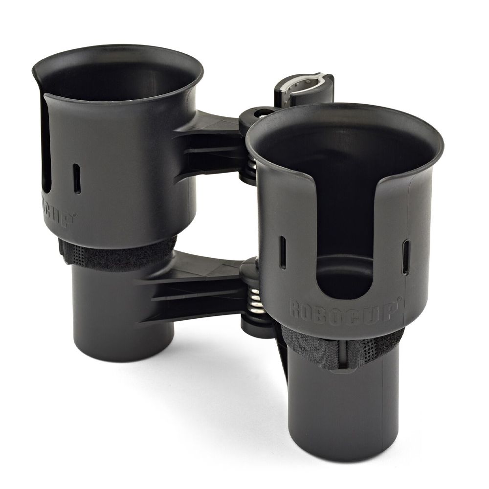The Inovativ RoboCup Dual Cup Holder is a clamp-on drink holder designed for Inovativ carts, but can also be clamped onto any flat or round surface up to 2" in diameter. The RoboCup's clamping action uses dual rubberized jaws and can further be secured with optional 4" plastic cable ties. The bottom caps are removable to have a deeper space for items such as flashlights and to allow access for cleaning the RoboCup. Two hook-and-loop straps are included for multiple uses, including tightening the cup area to secure drinks of different sizes. The RoboCup is made of polyresin with UV inhibitors added for extra durability. The springs and hardware are stainless steel for rust prevention.