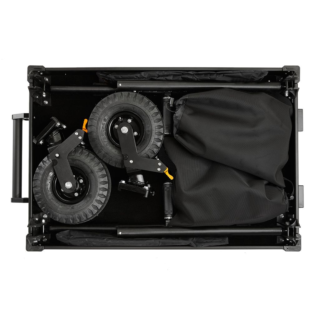 The Voyager NXT uses generic 10″ steel casters with our aluminium dovetail adapter. They are easily removable and pack away into the carts internal space when collapsed.