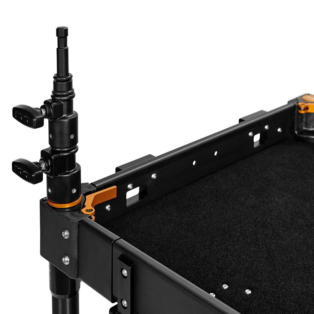 The Two-Stage Corner Mast Riser has a knurled 5/8 Baby Pin that fits into any of the Apollo’s 4 upright post. Due to the Apollo’s Corner-Cam Lock System design, the mast-riser seamlessly integrates into the corners of the top shelf, staying clear of the carts work surface. You can quickly mount a variety of items that have a 5/8 baby pin receiver.