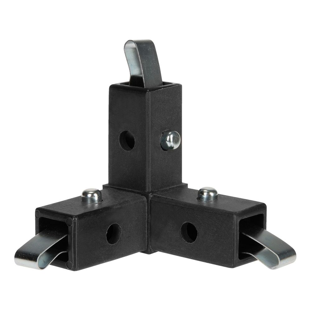 Integral to the versatile and modular system design, this Scrim Jim Cine 3D Corner Frame Connector from Westcott is used to connect any three Scrim Jim Cine frame tubes at a corner for making three-dimensional light control tools, such as cubes or free-standing reflector panels. A built-in positive locking button ensures a secure connection with the frame tube and its durable construction helps to maintain rigidity throughout long shoots and day-to-day use.