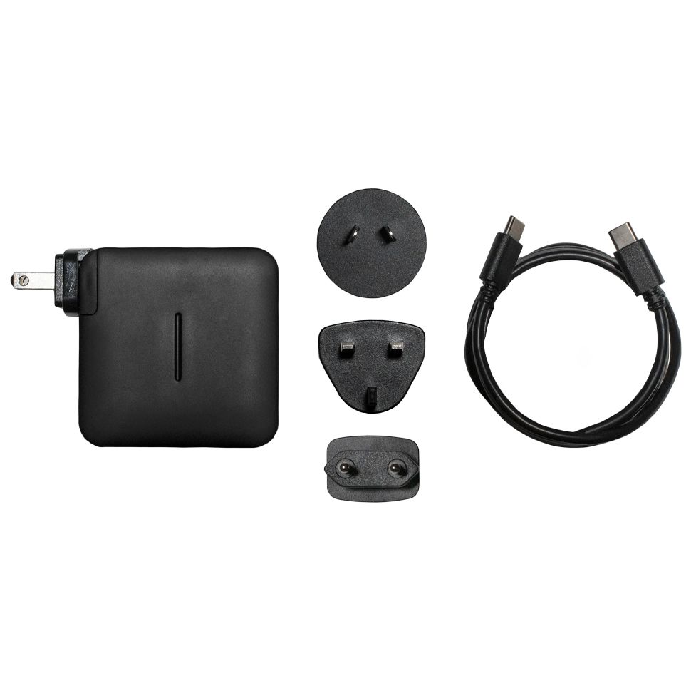 High-powered 61W USB-C charging unit for VidiU Go. Includes a USB-C to USB-C cable, wall adapter and universal mount plugs.