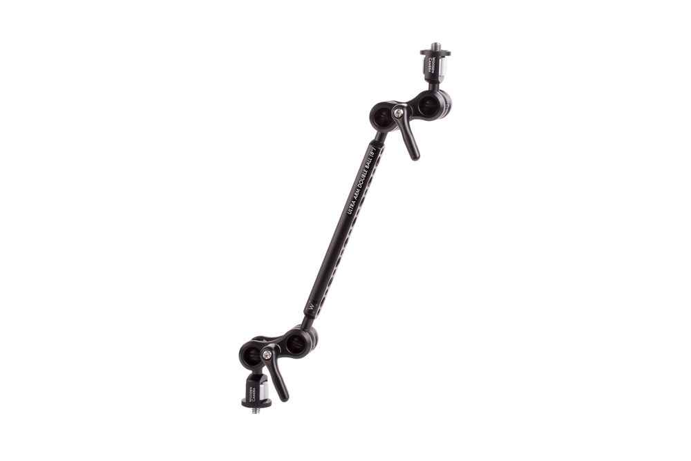 Ultra Arm Monitor Mount (1/4-20 to 3/8-16, 8") is an articulating arm with two sets of 25mm (1 inch) double ball joints which allow a monitor or accessory to be positioned in just about any orientation. Tool-less 1/4-20 knobs on one end and 3/8-16 knob on the other with non-slip rubber pads make setup quick and easy. Also included are two locating pins that can be installed on the 3/8-16 end turning it into an ARRI accessory mount compatible device! Black centre thumbscrews ratchet to allow for easy positioning. The 8" title refers to the centre extension length but actual length fully extended measures 364mm (14.3 inches).