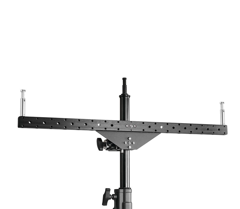 Need to mount more monitors? Well the Dual Bar gives you the ability to easily mount 2 monitors by simply clamping the Dual Bar to a stand. The advantage of this is that you keep the top section of the stand free for other items like wireless transmitters. The Dual Bar has a total of 18 x 3/8-16 threads providing you several position options for the baby pins to accommodate different sized monitors. We offer 2 type of baby pins. The standard type that will screw-in to the 3/8-16 threaded holes, or our new Crossbar Baby Pin Plug that connects by sliding over the top of the Dual Bar and locking to it using a 1/4-20 bolt. The advantage of this is that the baby pin will not unscrew if the item connected to it rotates.