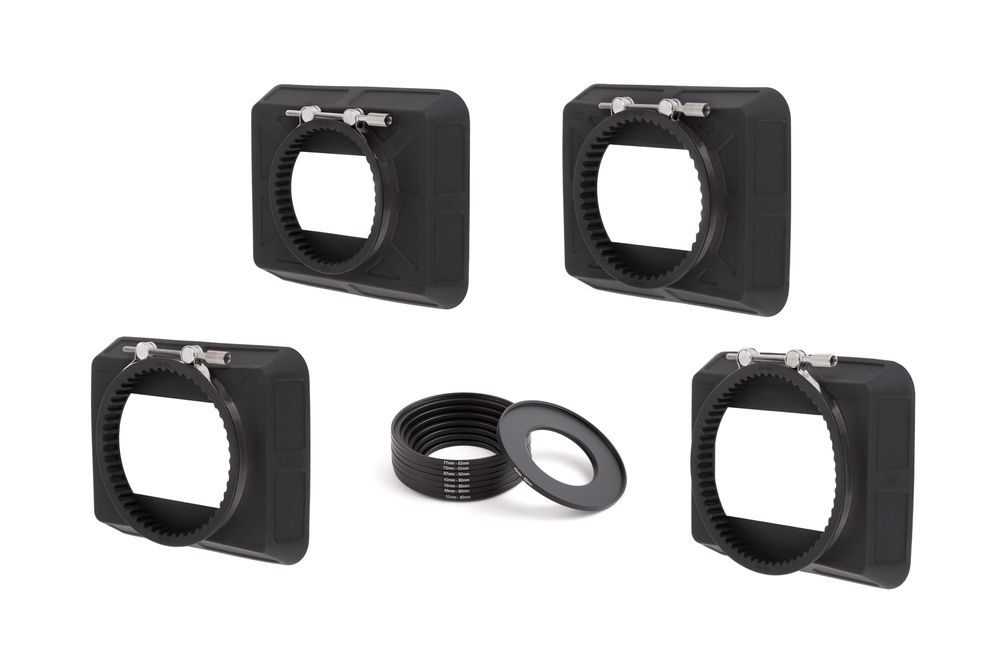 Zip Box Double 4x5.65 Kit (80-85mm, 90-95mm, 100-105mm, 110-115mm, Adapter Rings) is a bundle that includes the Zip Box Double 4x5.65 (80-85mm), Zip Box Double 4x5.65 (90-95mm), Zip Box Double 4x5.65 (100-105mm), Zip Box Double 4x5.65 (110-115mm), and the Zip Box Adapter Rings (49, 52, 55, 58, 62, 67, 72, 77mm) at a reduced package price. Zip Box 4x5.65 holds two Panavision sized 4x5.65" (100x144mm) filters and clamps to the front of lenses between 80 to 85mm, 90 to 95mm, 100-105mm, and also 110 to 115mm in exterior lens diameter. The lens shade design allows for even the widest lenses and sensor sizes to be covered without vignetting. Zip Box is extremely lightweight and weighs about the same as a standard filter which makes it perfect for gimbal and drone use. Stainless steel components and unibody rubber design are very durable and stand up to the toughest conditions.