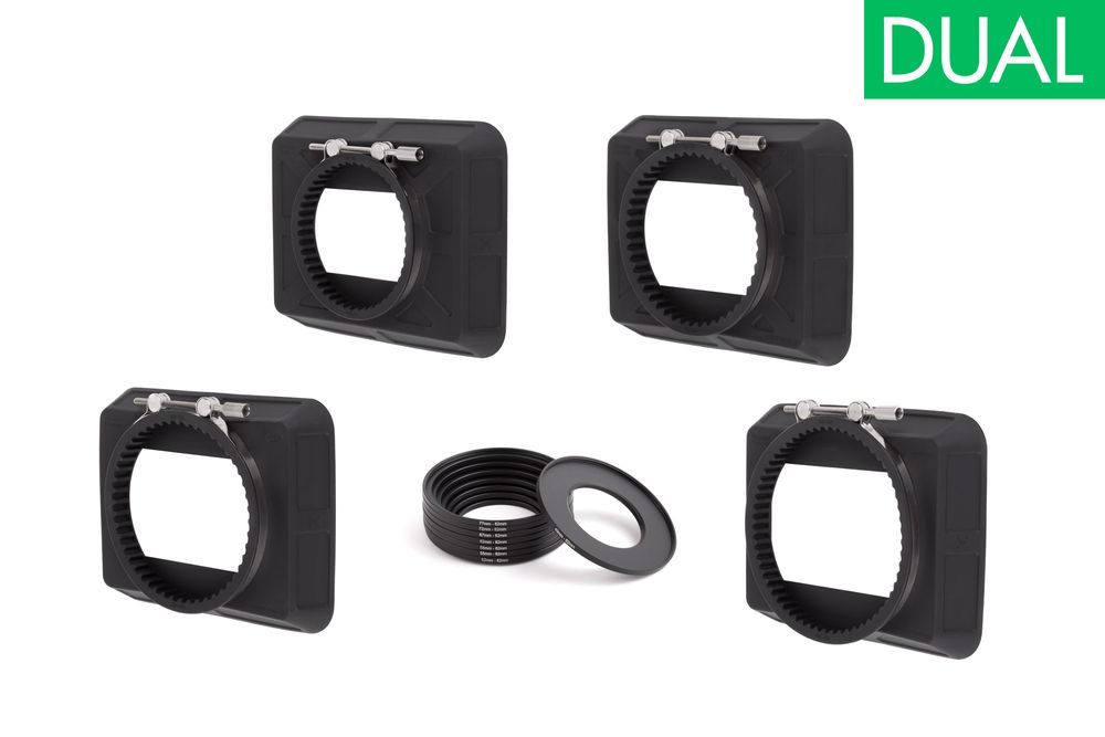 Zip Box Double 4x5.65 Kit (80-85mm, 90-95mm, 100-105mm, 110-115mm, Adapter Rings) is a bundle that includes the Zip Box Double 4x5.65 (80-85mm), Zip Box Double 4x5.65 (90-95mm), Zip Box Double 4x5.65 (100-105mm), Zip Box Double 4x5.65 (110-115mm), and the Zip Box Adapter Rings (49, 52, 55, 58, 62, 67, 72, 77mm) at a reduced package price. Zip Box 4x5.65 holds two Panavision sized 4x5.65" (100x144mm) filters and clamps to the front of lenses between 80 to 85mm, 90 to 95mm, 100-105mm, and also 110 to 115mm in exterior lens diameter. The lens shade design allows for even the widest lenses and sensor sizes to be covered without vignetting. Zip Box is extremely lightweight and weighs about the same as a standard filter which makes it perfect for gimbal and drone use. Stainless steel components and unibody rubber design are very durable and stand up to the toughest conditions.
