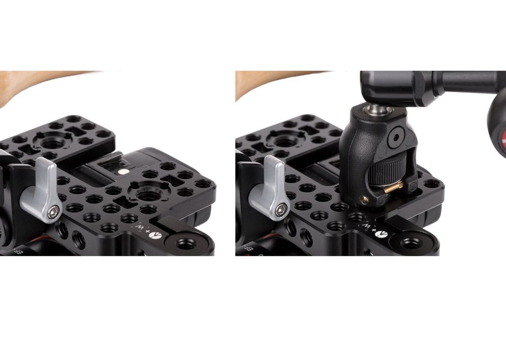 The cage includes a reversible top handle which can be repositioned over the lens area when an XLR adapter is in use. Built into the handle is a cold shoe mount and a 15mm tube clamp for mounting any of our UVF Mount kits used with 3rd party electronic viewfinders. The handle can also fold down when packing your bag and can even be reconfigured onto the left, vertical 15mm rod for a secondary grip!