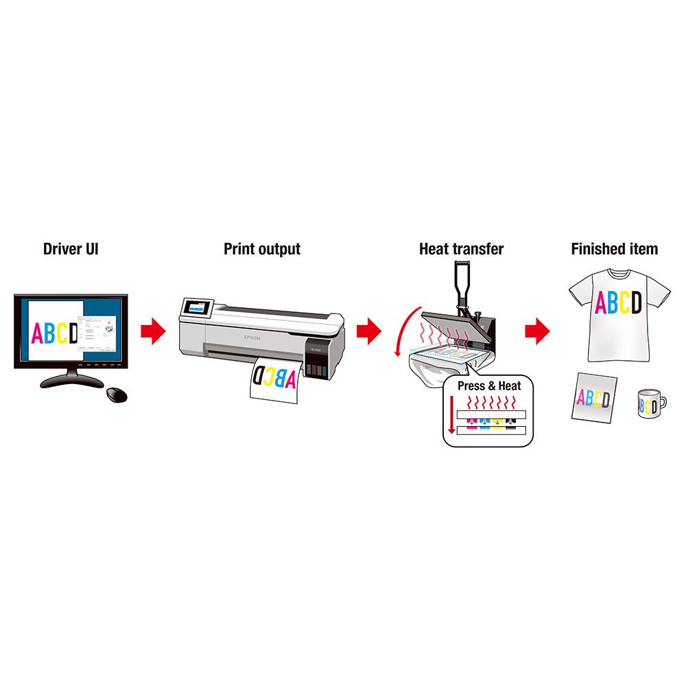 The Epson SureColor DS series has long offered a superior production platform; developed from the ground up for Dye Sublimation, it combines superior image quality, better colour, lower running costs, and higher reliability, all backed with a comprehensive factory warranty. The F560 takes the concept further with a low-cost package that provides a total imaging solution complete with software, ink and media. Designed for custom merchandise and décor production, it is also suited to photo imaging, hard signage, and even small fabric applications. It features a compact design with flexible media support, and a Continuous Ink Supply System (CISS). Prints are made on paper which transfers (sublimates) via a heat press onto material with a polyester base or polyester pre-treatment.