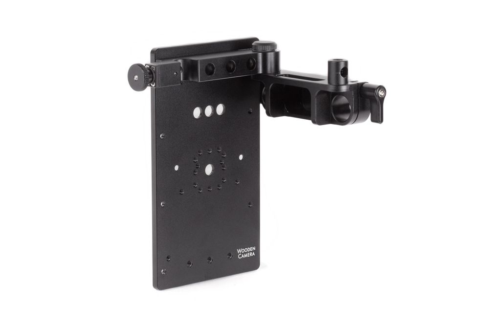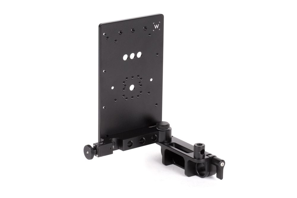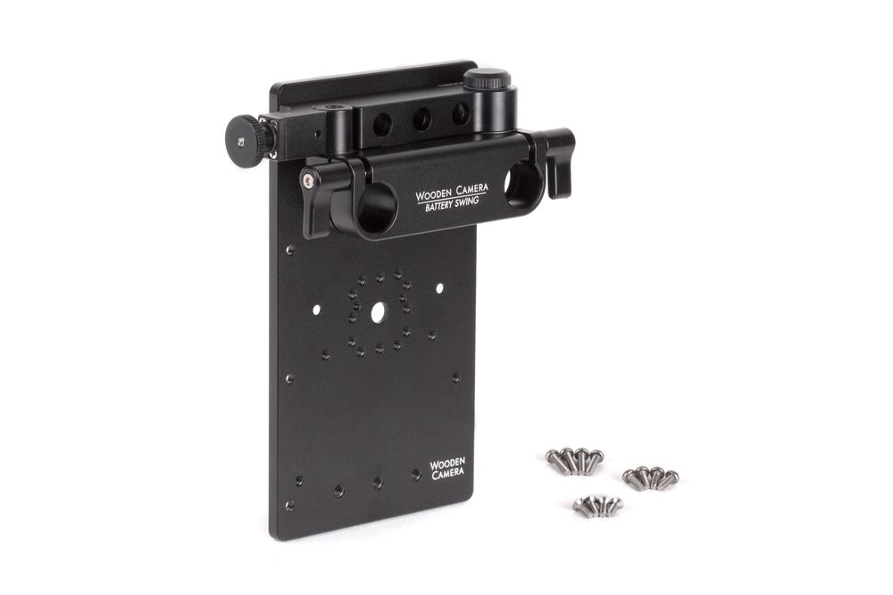 Battery Swing provides standard V-Mount and Gold Mount hole patterns for mounting WC battery plates and the D-Box (Alexa Mini). Quickly access the back of the camera by pulling the black pin and swinging open. Mounting bracket has integrated 15mm rod openings and is most commonly used in the lower position for bottom rods. Battery Swing can be mounted to top rods by moving the swing arm to the top row of holes on the battery bracket.