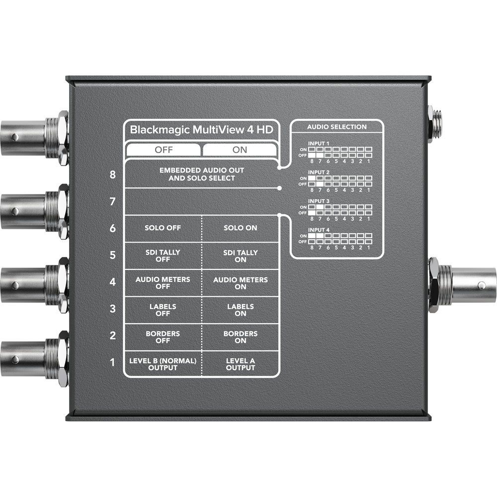 Each view can display custom overlays like labels and audio meters, and the integrated USB 2.0 interface can be used for updates. The MultiView 4 HD's metal housing measures approximately 5.3 x 3.6", and it includes a power supply with international adapters.