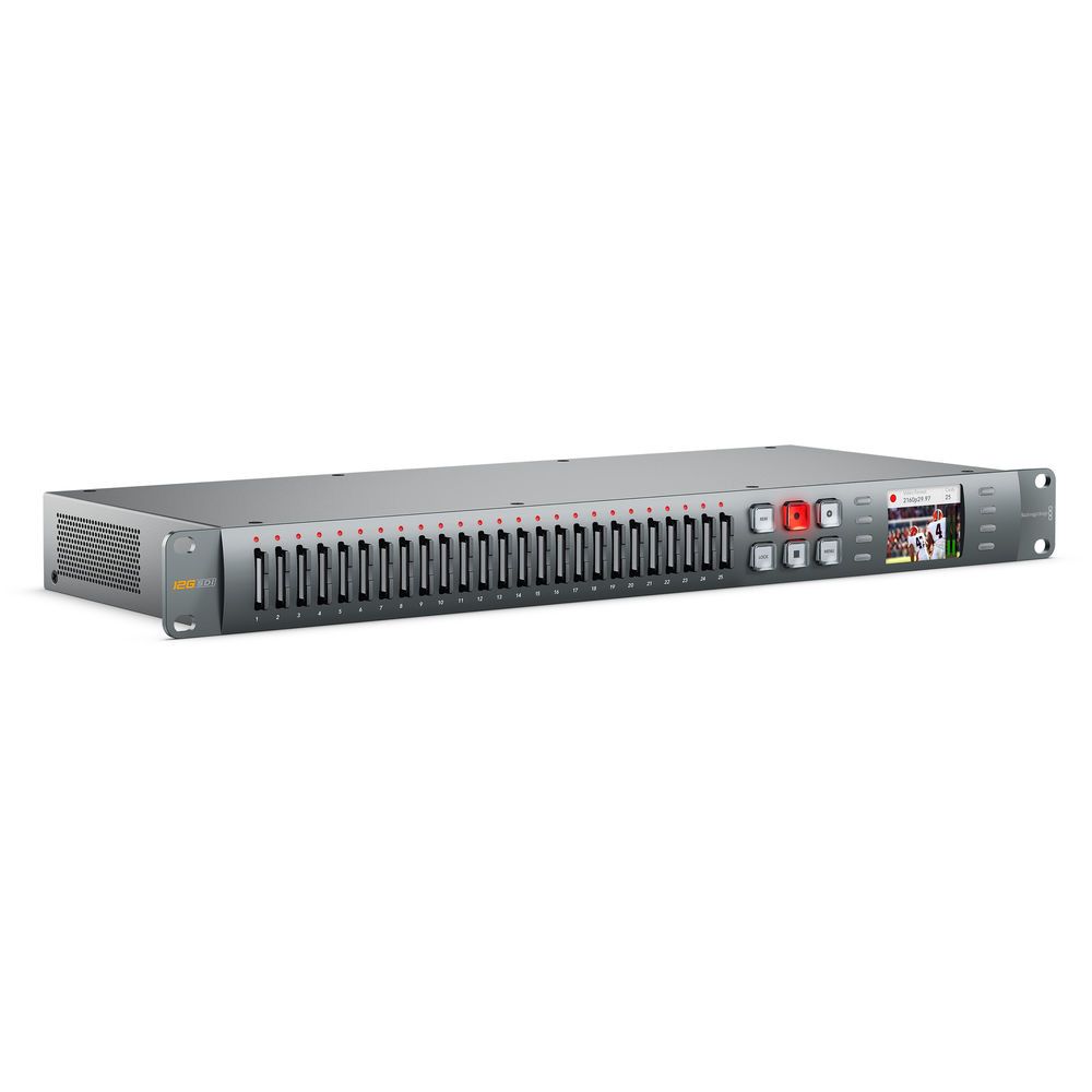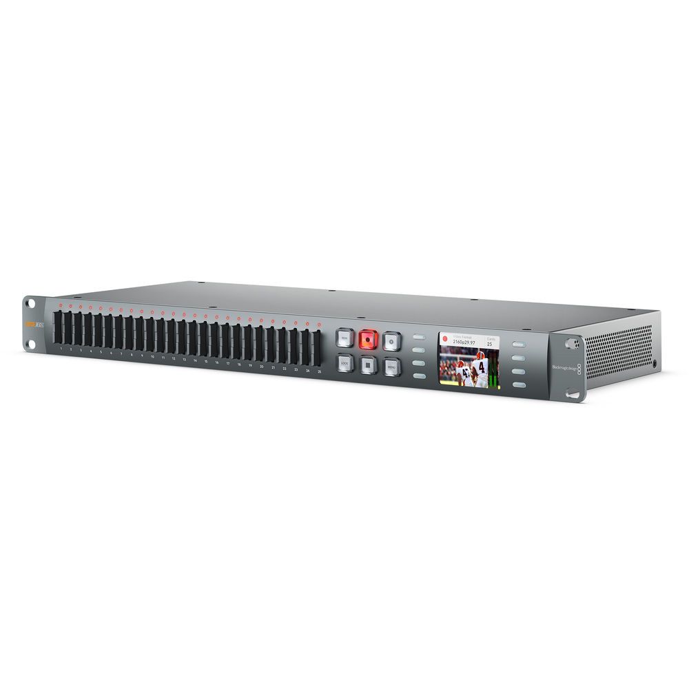 The Blackmagic Duplicator 4K features a realtime H.265 encoder and 25 SD card recorders that are miniaturized into a single rack unit design. The machined metal design is durable, lightweight, and small enough to take on the road. That means you can duplicate content right where you're recording and sell it. The front panel has an LCD display for status, and professional broadcast connections such as 12G-SDI with loop through and RS-422 deck control are on the rear so you can connect multiple units together inside a standard 19" rack and record more cards at the same time.