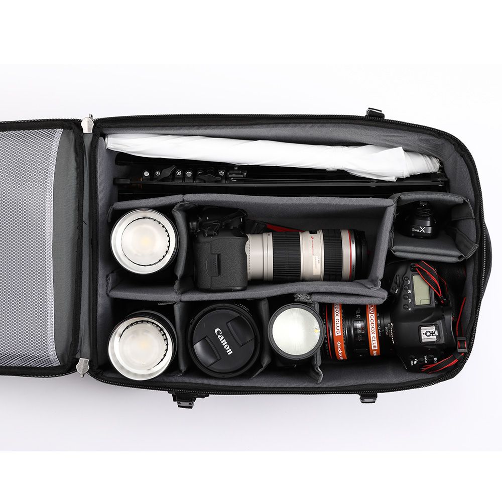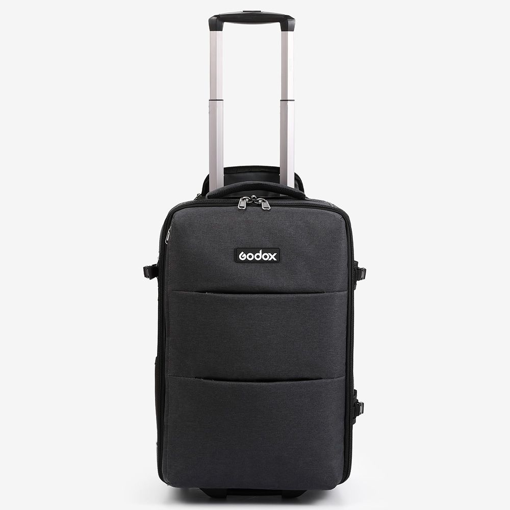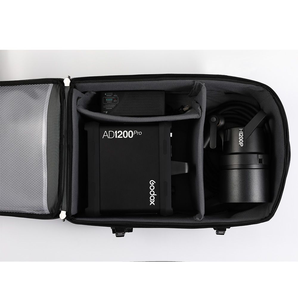 The Carrying Bag for AD1200 Pro Battery Powered Flash System from is designed to transport and store the AD1200 Pro Battery Powered Flash System set. The case can contain one AD1200 Pro flash head, one battery-powered base, and the related accessories. It features a folding handle and casters for easy transport, plus two exterior zippered pockets, and a pair of exterior straps for attaching a light stand or tripod.