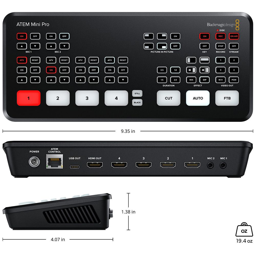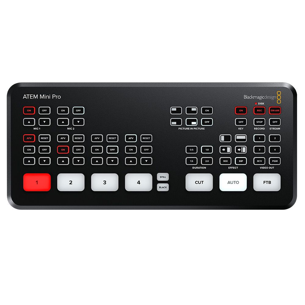 Includes all the features found in ATEM Mini, plus more! You get recording direct to USB flash disks in H.264 plus direct streaming via the Ethernet to YouTube Live and more. There's also a multiview with 4 cameras, media, preview and program plus status of recording, streaming and audio.