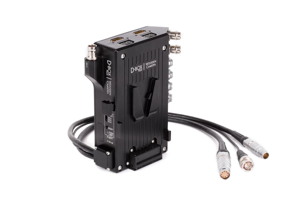 D-Box Plus (ARRI Alexa Mini, V-Mount) is an improvement on the very popular D-Box Alexa Mini. D-Box Plus interfaces with the camera's Power, EXT, and SDI ports . The DC input is now a full size 4pin XLR connector and is prioritised to be used first, leaving the onboard battery fully charged.