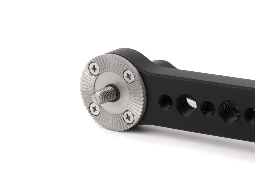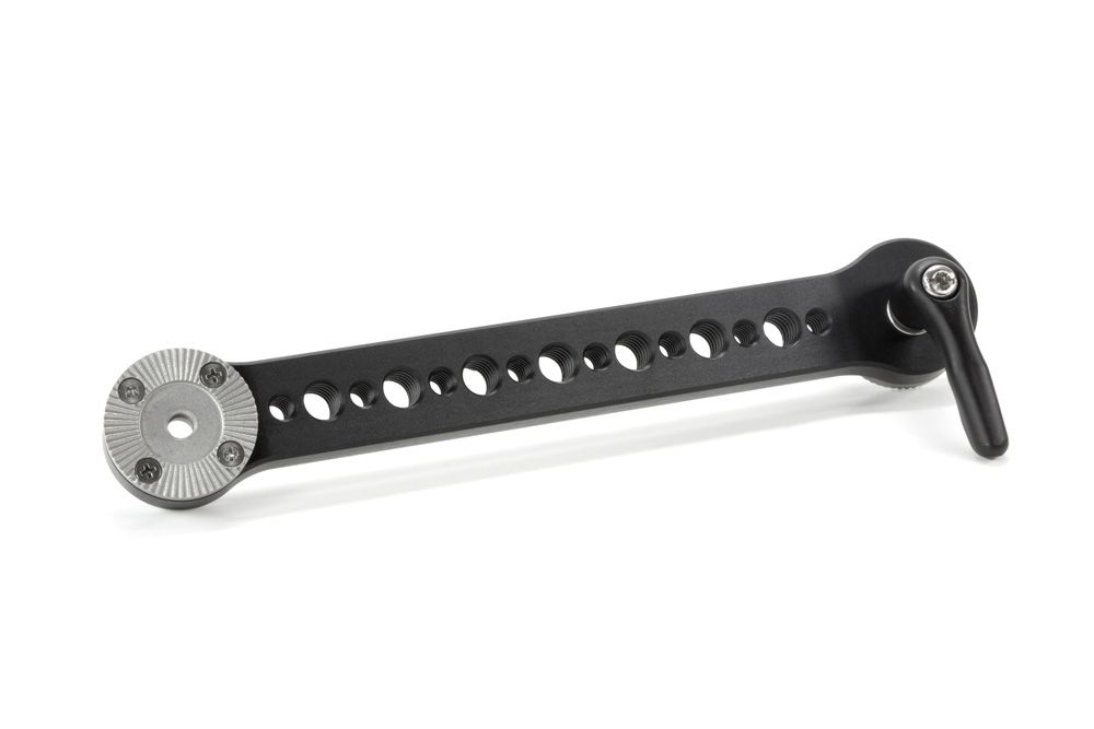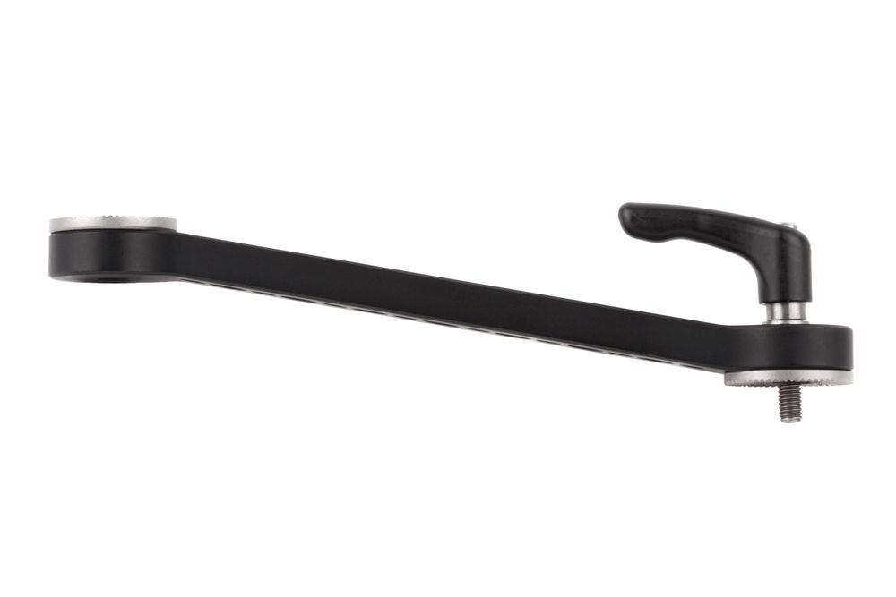 Rosette extension arm with ARRI style rosettes on each end. For use with Crossbar, Bolt on Rosette (ARRI), Rosette Handle, and other ARRI compatible rosette equipment. M6 adjustable thumbscrew. Extends hand grip 6.6 inches (168mm) and jogs out 1.6 inches (42mm).