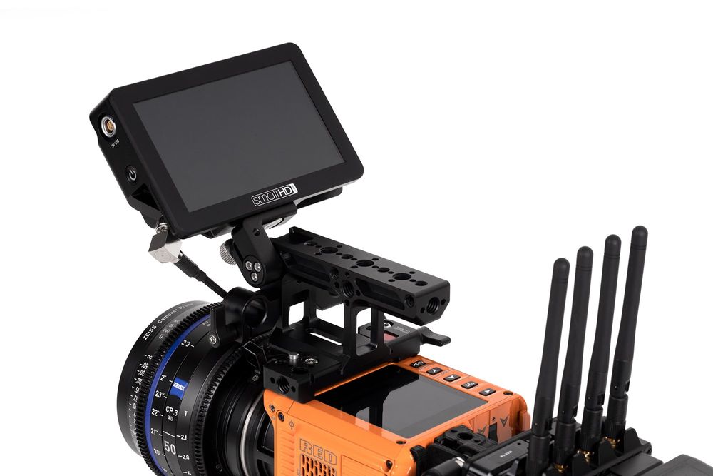 Monitor Hinge can attach into ARCA slot and provides a direct 1/4-20 mount for SmallHD monitors. Included rubber pad can be added for attaching third party monitors. A 15mm mounting spud is included and allows monitor arm to be quick released and attached onto Top Handle.