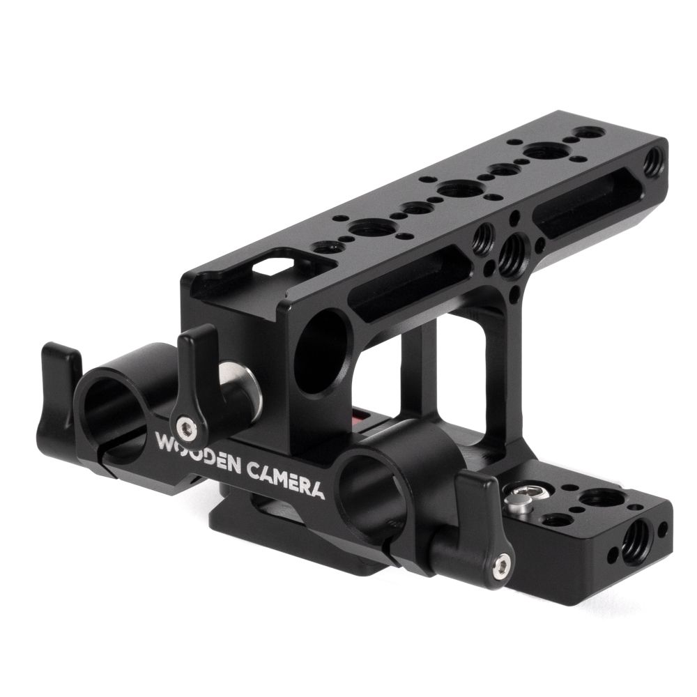 Included Top Handle slides into ARCA slot and leaves camera control screen easily accessible. Shoe mount on top can hold on-camera lights and microphones and side 15mm opening can hold UVF Mount V2. 1/4-20 and 3/8-16 ARRI accessory mount in several places and 15mm lightweight rod bracket on front for attaching lens motors and more.