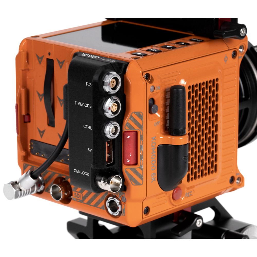 B-Box (RED® KOMODO™) attaches to the camera-right BP-9 battery slot and provides a breakout for the camera’s EXT connector. Battery Slide Pro V-Mount or Gold Mount for RED KOMODO can be used simultaneously and custom right-angle LEMO compatible connector allows for neat cable run. Canon BP-9 batteries could also be attached in camera-left slot while B-Box is used.