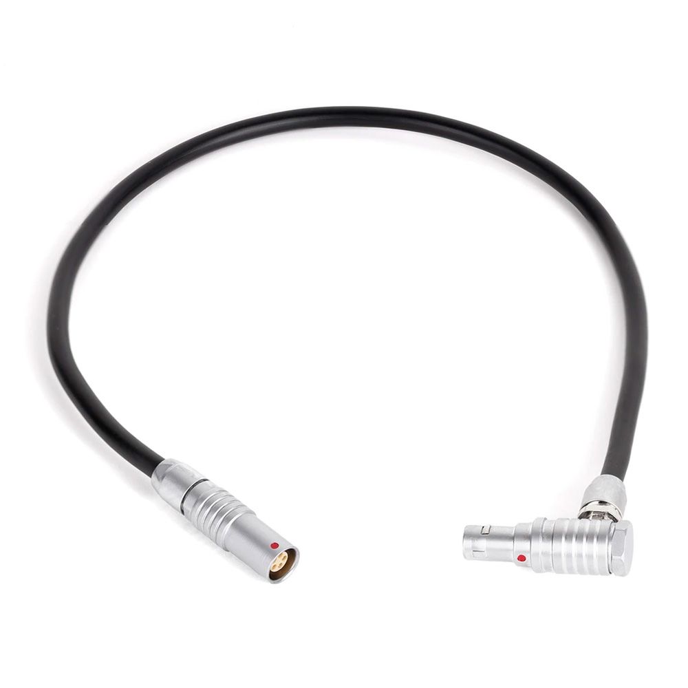 RED KOMODO Timecode In/Out Cable is a female, 5pin LEMO to right angle, RED EXT, 9pin LEMO. The connector exits toward the operator side, leaving other ports or accessories on the back of the camera accessible.
