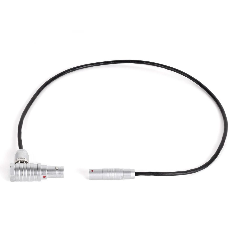 RED KOMODO CTRL Control Cable is a Female 4pin 00 LEMO compatible connector to a right angle, RED EXT, 9pin LEMO. The connector exits toward the operator side, leaving other ports or accessories on the back of the camera accessible.