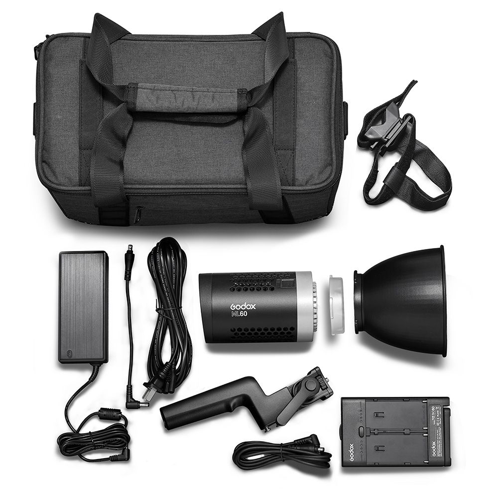Made with run-and-gun shooting in mind the ML60 has a removable handle as well as an umbrella socket. Ready for worldwide use, the ML60 runs on 100 to 240V, thanks to the included AC adapter, but it will also run on two NP-F970 batteries when AC power is unavailable. Godox has included a carrying case for storage and transport.