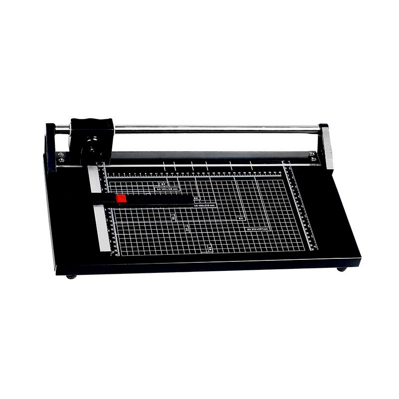 This rotary paper cutter adopts an automatic paper weighting design, self-grinding roller blade and ground blade body, which makes the roller blade automatically sharpen and keep its self sharpened.