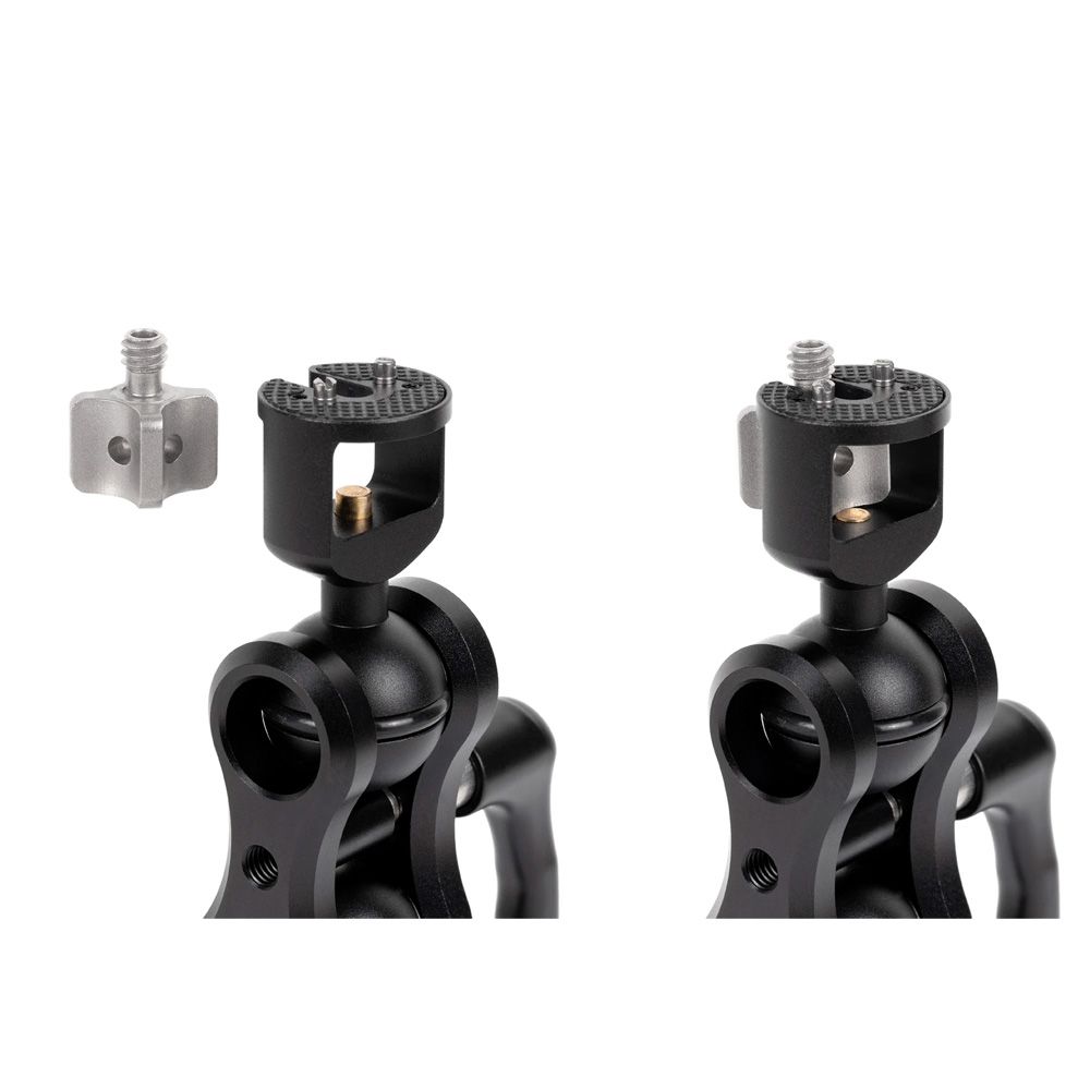 Easily swap from ¼-20 Ultra Ball Knob to â Â-16 Ultra Ball Knob by depressing the brass pin and sliding out. Four locating pins are included in the Ultra Arm base and can be installed in either SmallHD or ARRI Standard spacing for securely mounting accessories.