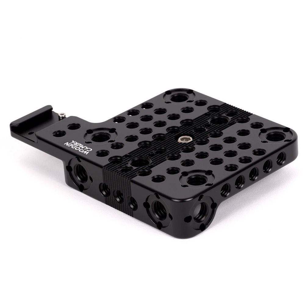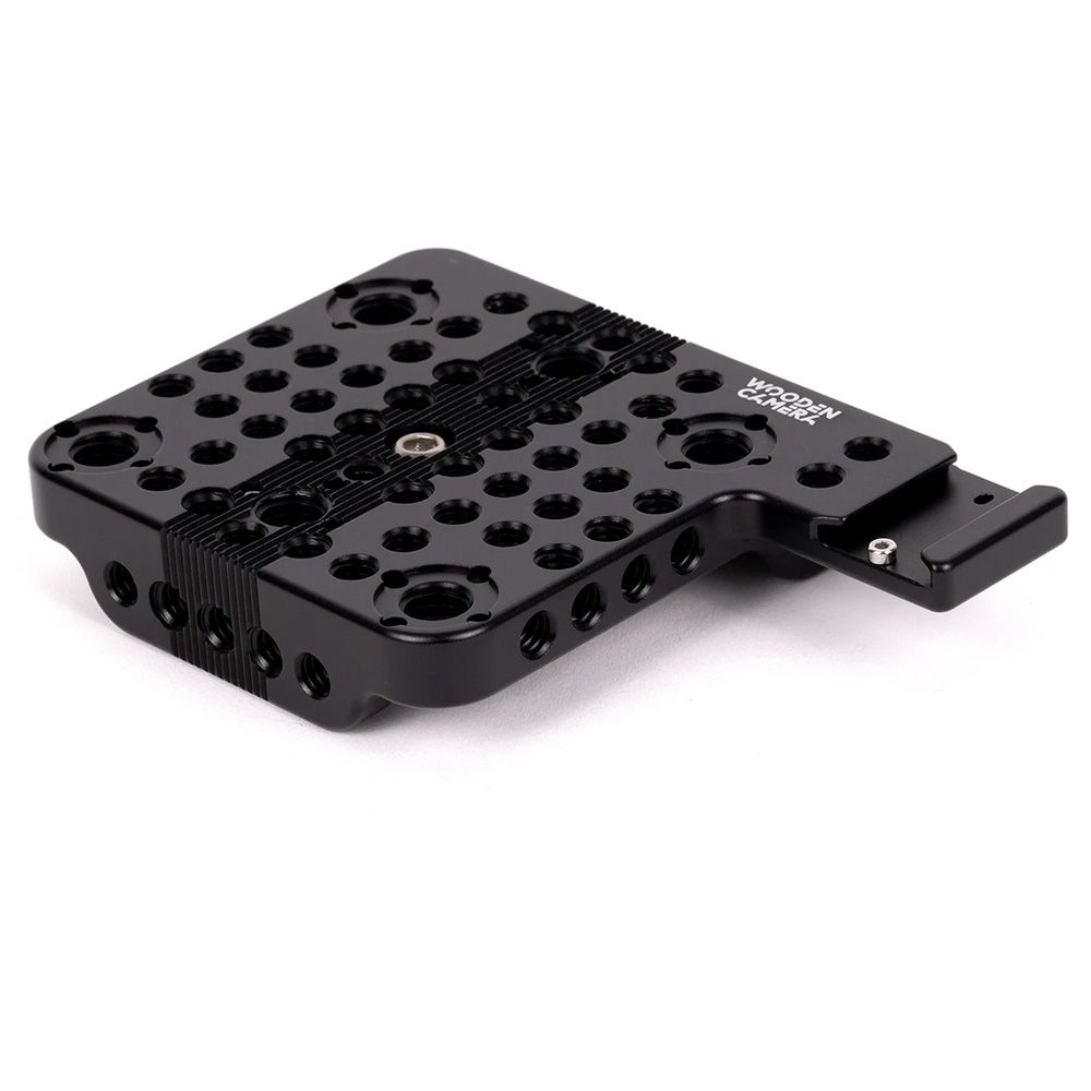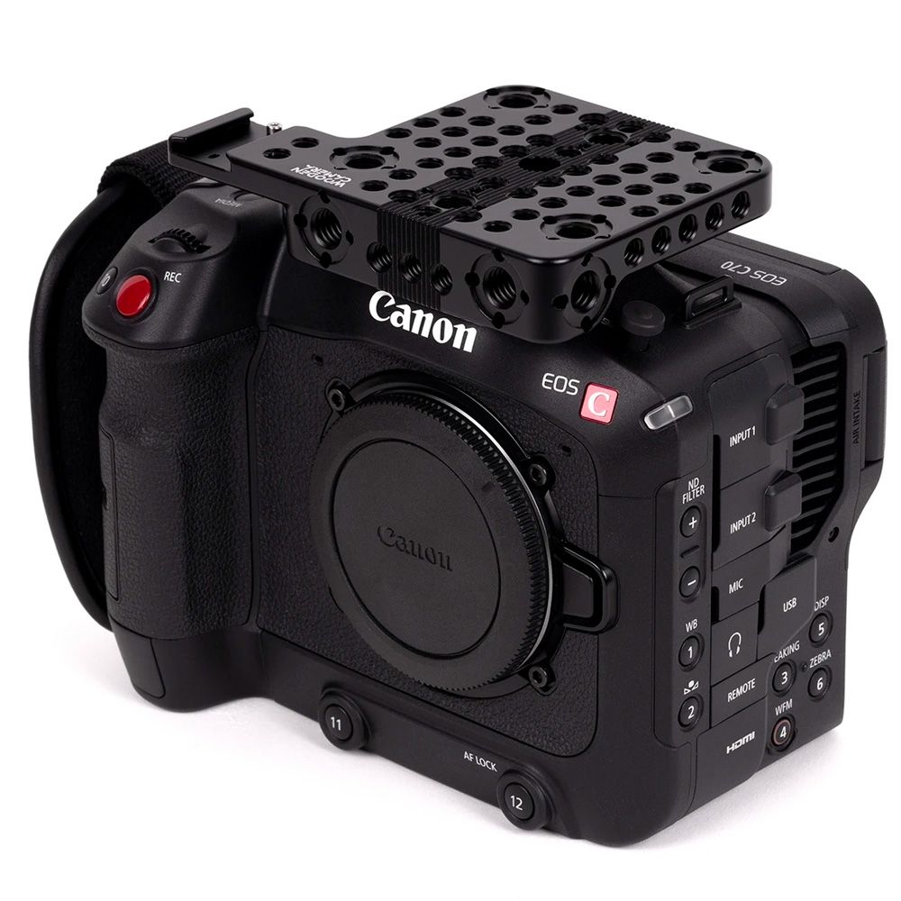 Cheese plate designed to attach Wooden Camera and other third-party accessories to the Canon EOS C70. This top plate contours the top of the camera body to ensure a seamless fit. To attach, align ridges at the base of the plate to interlock with the standard Canon Accessory Mount (a small grid within the camera’s hot shoe); tighten the captured ¼”-20 screw.