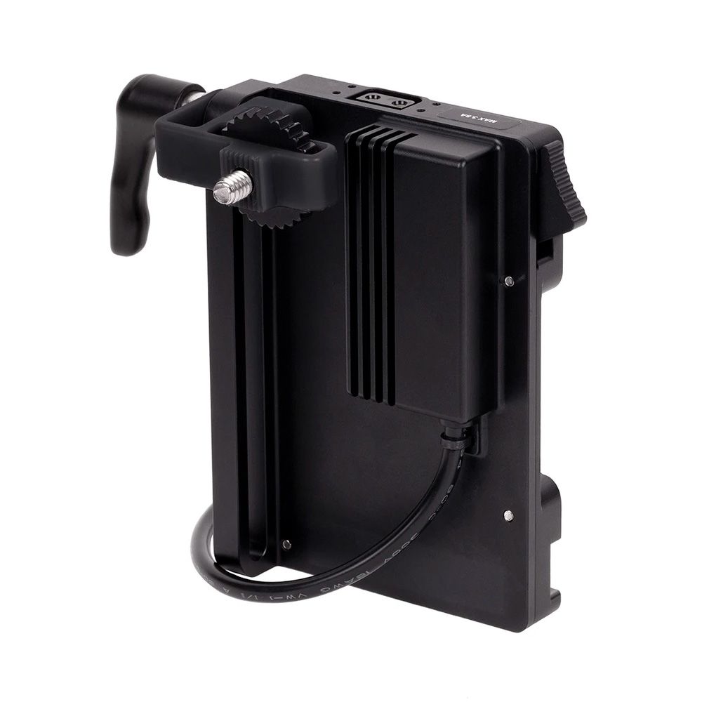 Custom WC Pro Gold Mount battery plate for providing external power to the Canon EOS C70. Features 3x D-Tap ports for accessory power, including a digital fuse which cuts off accessory outputs while leaving the camera powered. Battery Slide Pro (Canon C70) can be attached to any standard Canon Accessory Mount by aligning the interlocking ridges and turning the attachment thumbwheel to tighten a ¼”-20 screw; rods are not required. This system retains access to the original C70 battery compartment, enabling operators to hot-swap power between both BPU and brick batteries. To adjust the battery plate’s vertical position, loosen the pivoting clamp and slide the plate up or down.